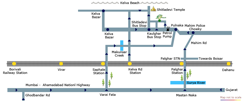 Approx Distance by Road: Palghar - 12 Kms, Manor-32Kms, Thane-105Kms, Dahisar Check Naka-95Kms, Mumbai (city)-140kms, Vapi-100kms, Daman-120kms, Valsad-120 kms, Surat-190kms, Jawahar-75 kms, Nashik-175kms.